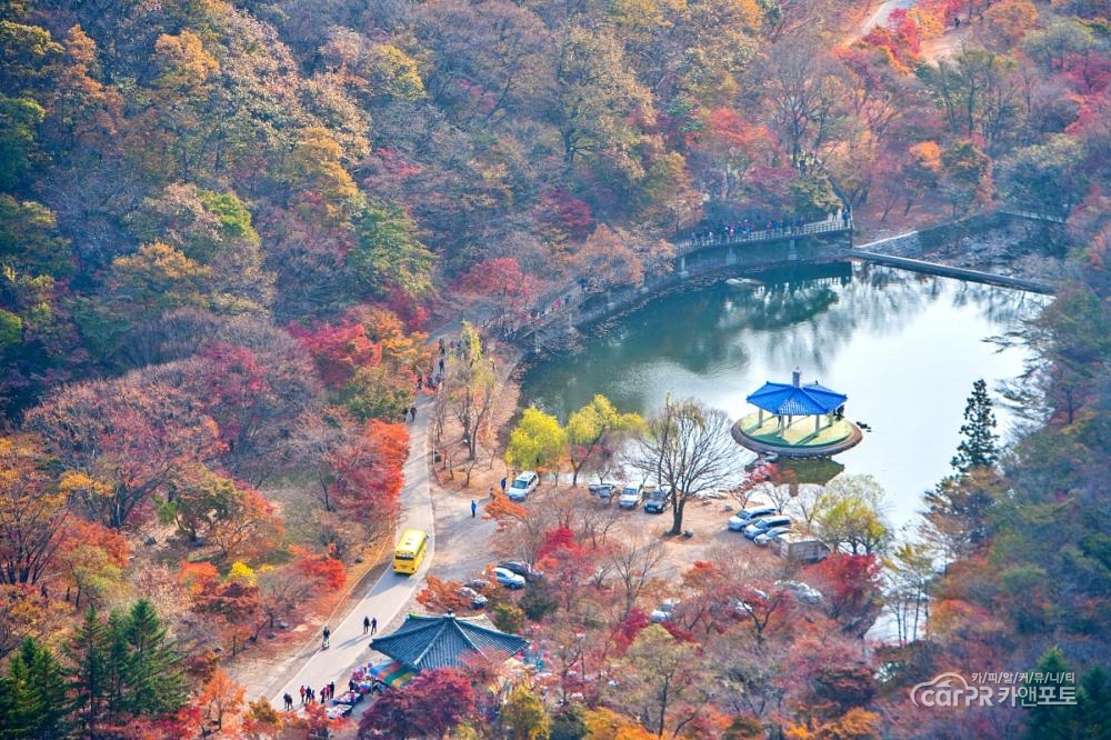 내장산 우화정에 노란 유치원의 버스